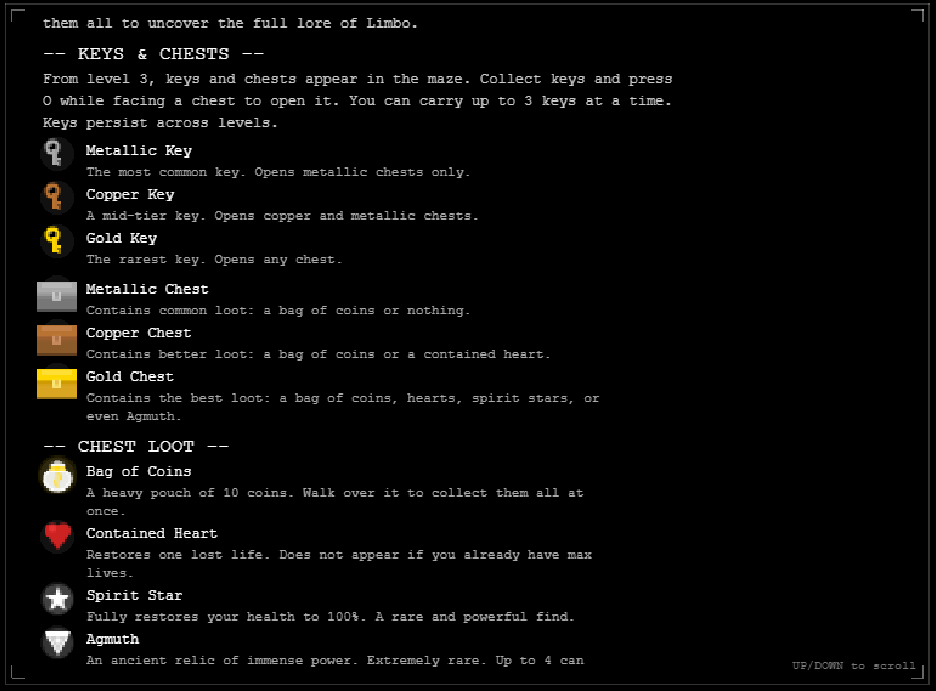 - Find keys (metallic, copper, gold) to unlock treasure chests with valuable loot